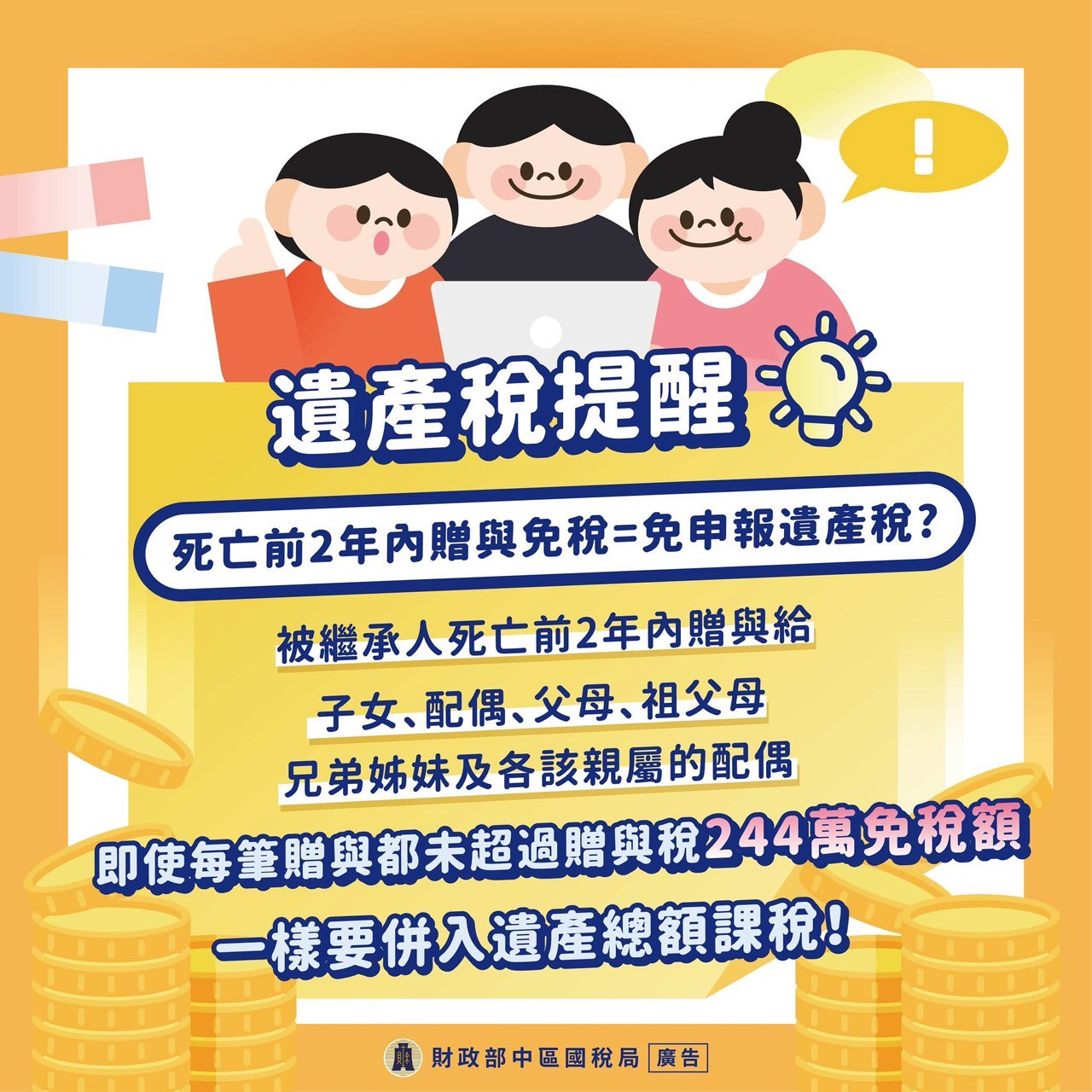 遺產稅提醒 死亡前2年內贈與免稅=免申報遺產稅