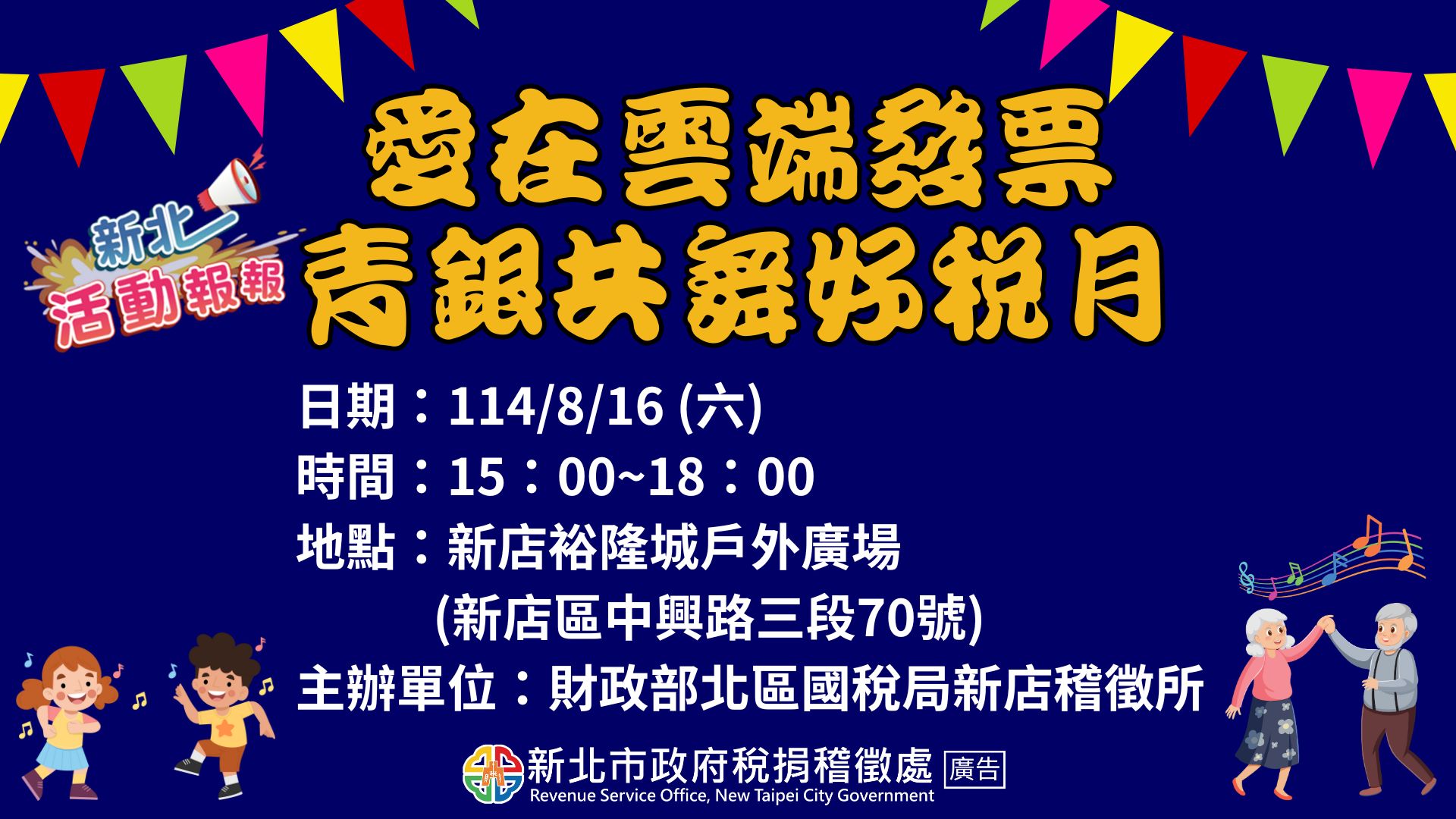 新店稅捐分處結合財政部北區國稅局新店稽徵所「愛在雲端發票,青銀共舞好稅月」,於114年8月16日(六)新店裕隆城戶外廣場辦理租稅宣導活動,當天按讚本處FB紛絲團-「稅不著呼叫暗光鳥」和訂閱YOUTUBE頻道-「新北租稅影音放送站」還可獲得精美小禮物一份!!歡迎大家一起來玩~