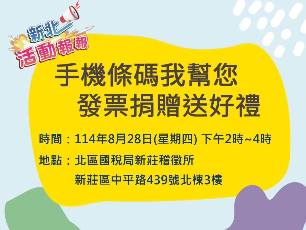 新北活動報報【手機條碼我幫您 發票捐贈送好禮】 時間:114/8/28(星期四)14:00 - 17:00 地點:北區國稅局新莊稽徵所3樓申報教室