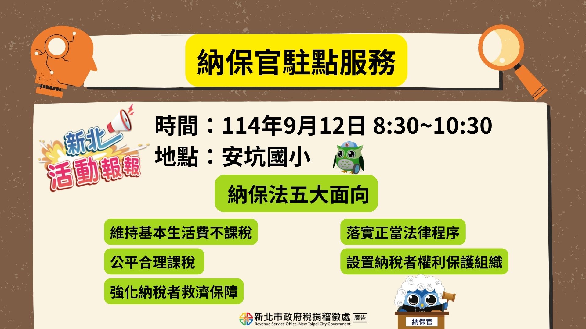 新北活動報報-9/12(五)8:30-10:30新店分處結合地政事務所地政專車巡迴服務之機會,於安坑國小設置納保官宣導攤位,透過現場諮詢及解答來強化納稅者救濟保障;另提供捐贈雲端發票兌換宣導品,此外現場新申辦手機條碼、加入本處FB粉絲團、訂閱YouTube頻道皆可獲得好禮1份歐!!歡迎踴躍參加~