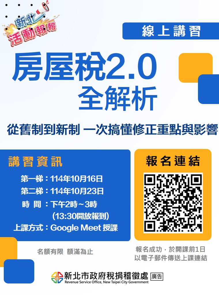 為落實居住正義、精進房屋稅制🏠【房屋稅2.0】已於113年7月1日上路,114年5月正式開徵。您是否也有下列這些疑惑💬新制上路對我有什麼影響❓要如何符合自住房屋資格❓什麼是單一自住稅率❓自住、出租、非自住該如何節稅❓課徵及歸戶方式…等,別擔心✨這些聲音小編都聽到了🧏本處林口分處將舉辦【房屋稅2.0全解析】線上講習,讓第一線稅務同仁帶領您👉從舊制到新制一次搞懂修正重點與影響!想了解的您🧐千萬千萬可別錯過了👇