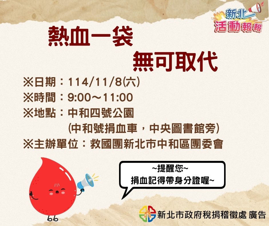 救國團新北市中和區團委會即將在四號公園的中和號捐血車舉辦聯合捐血活動✨