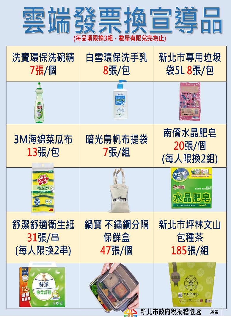 想要兌換實用日用品嗎? 只要捐贈未開獎雲端發票,就可以換精美又實用的宣導品唷~ 還有!還有!現場申辦手機條碼成功者,可以得到小禮物一份! 趕快來一起捐雲端發票做愛心,多項實用宣導品帶回家!! 時間:114年11月10日(星期一) 11:50–13:30 地點:新北市政府B1超商前(板橋區中山路一段161號B1)