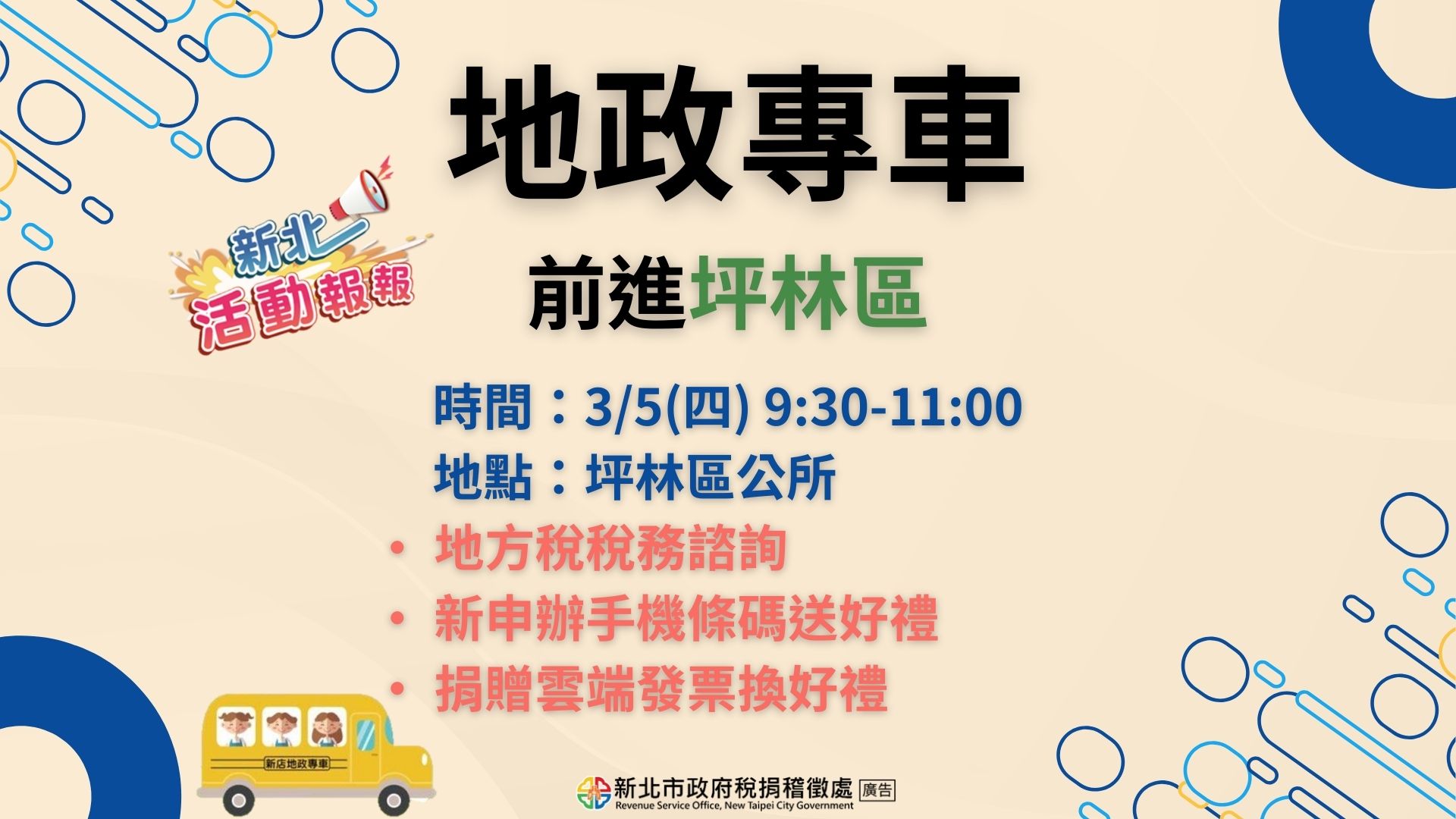 新北活動報報-3/5(四)9:30-11:00新店分處將於坪林區公所設置租稅宣導攤位,提供地方稅稅務諮詢、捐贈雲端發票兌換宣導品,此外現場新申辦手機條碼、加入本處FB粉絲團、訂閱YouTube頻道皆可獲得好禮1份歐!!歡迎踴躍參加~