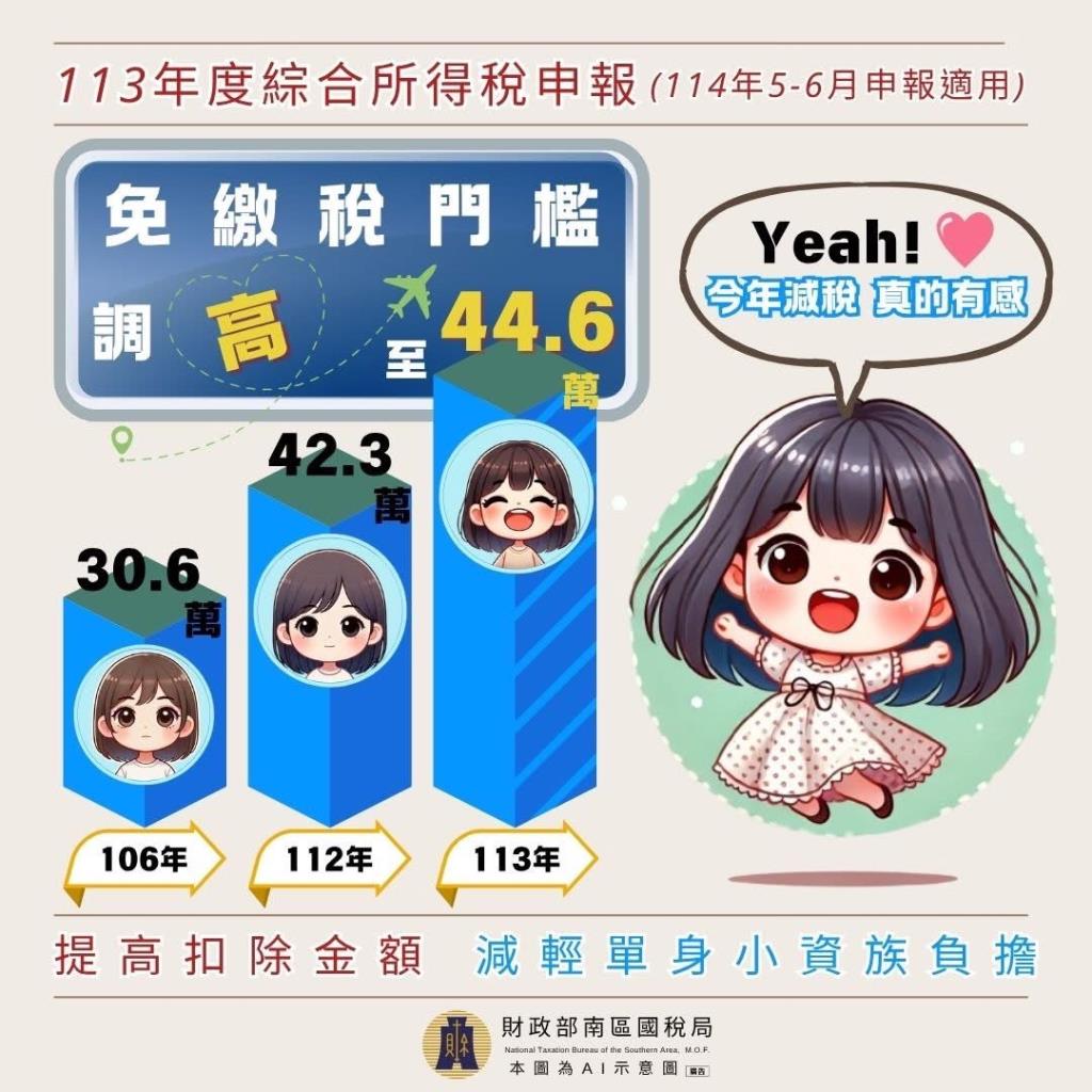 113年度綜合所得稅申報 免繳稅門檻調高至44.6萬