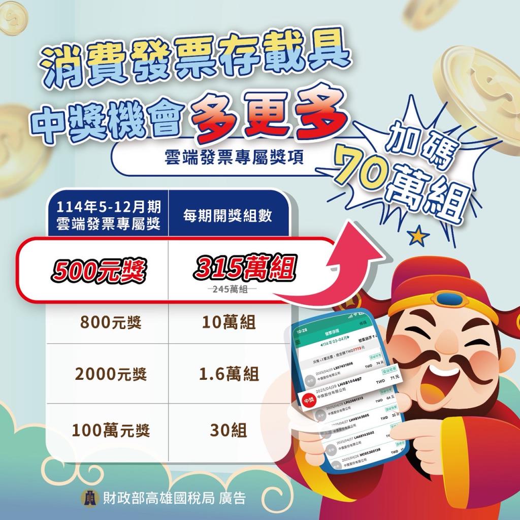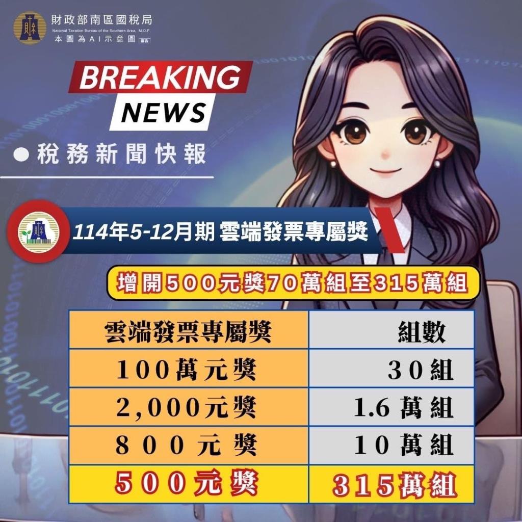 稅務新聞快報 114年5-12月期雲端發票專屬獎增開500元獎70萬組至315萬組