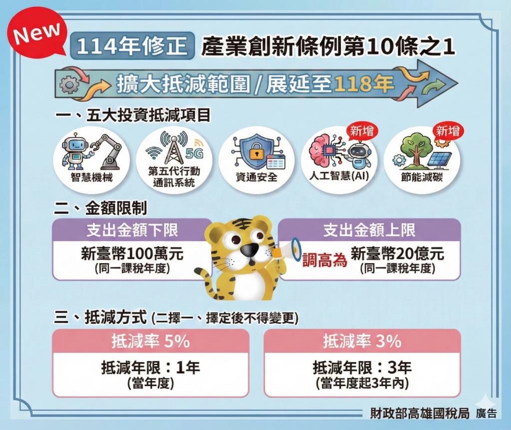114年修正產業創新條例第10條之1 擴大抵減範圍展延至118年