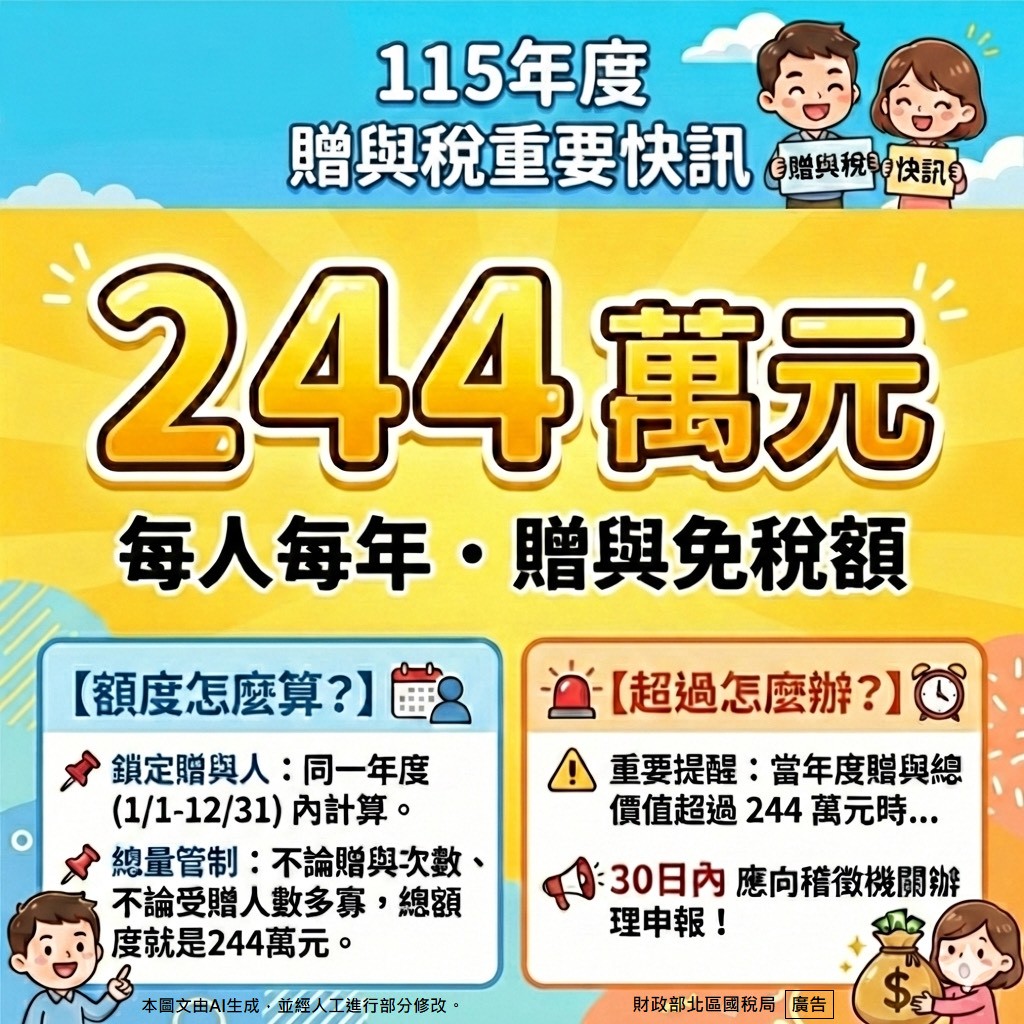 115年度贈與稅重要快訊 每人每年贈與免稅額244萬元